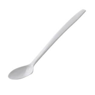 Cuchara plástica larga blanca para café o té, perfecta para revolver bebidas calientes. Su diseño compacto y resistente la hace ideal para cafeterías, oficinas o uso personal.